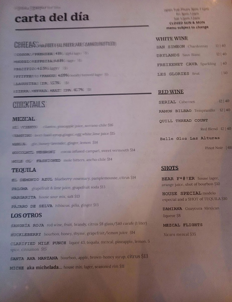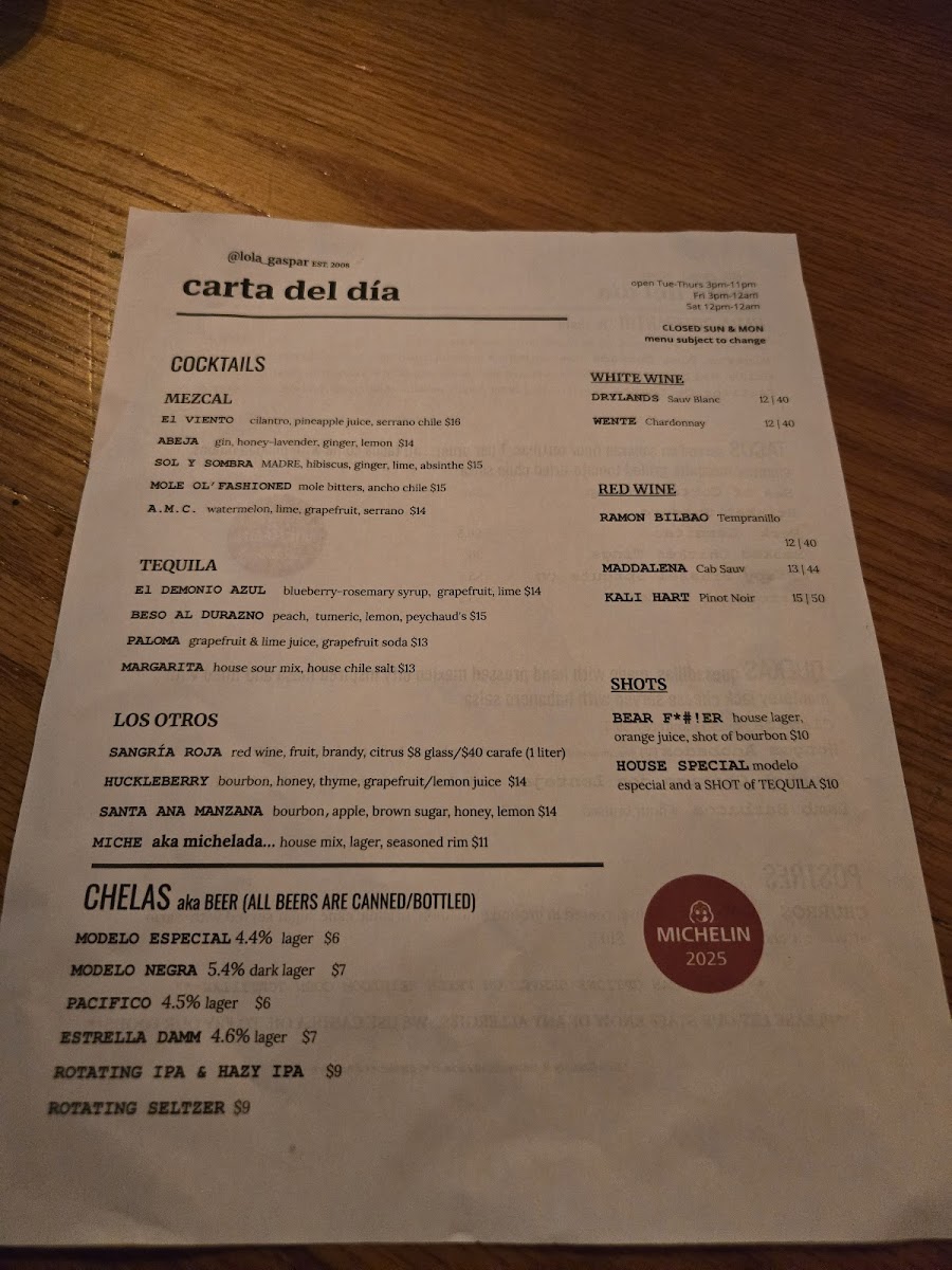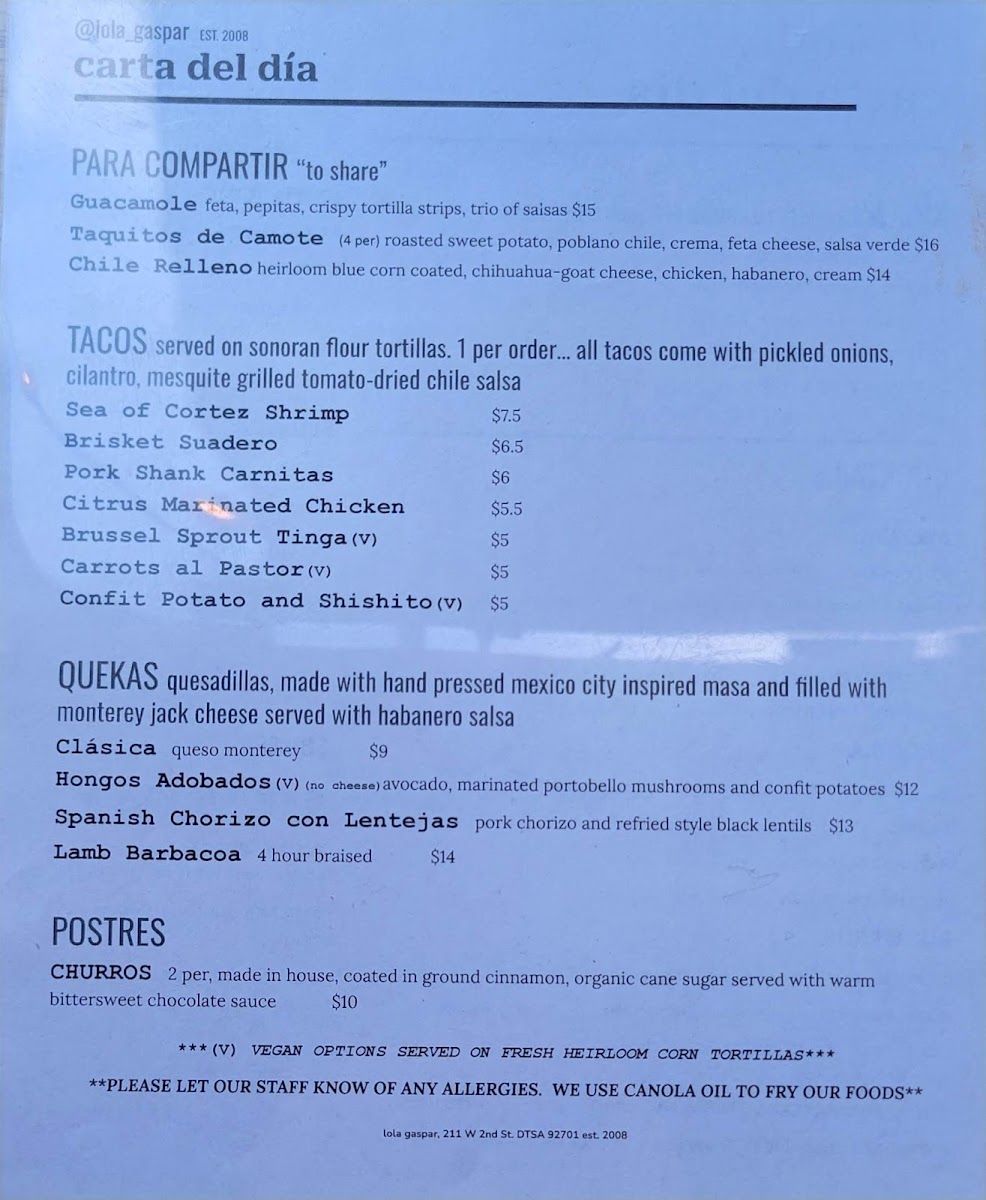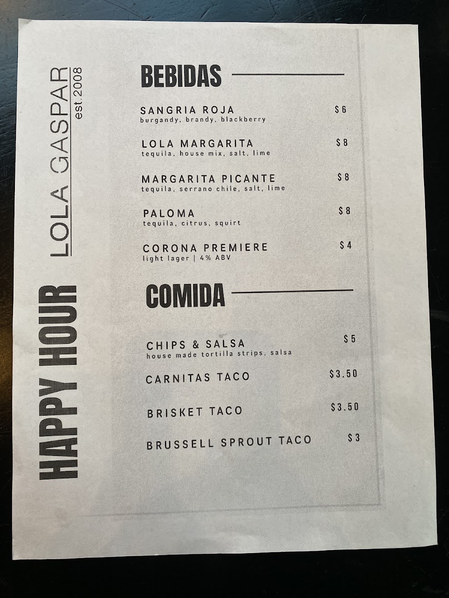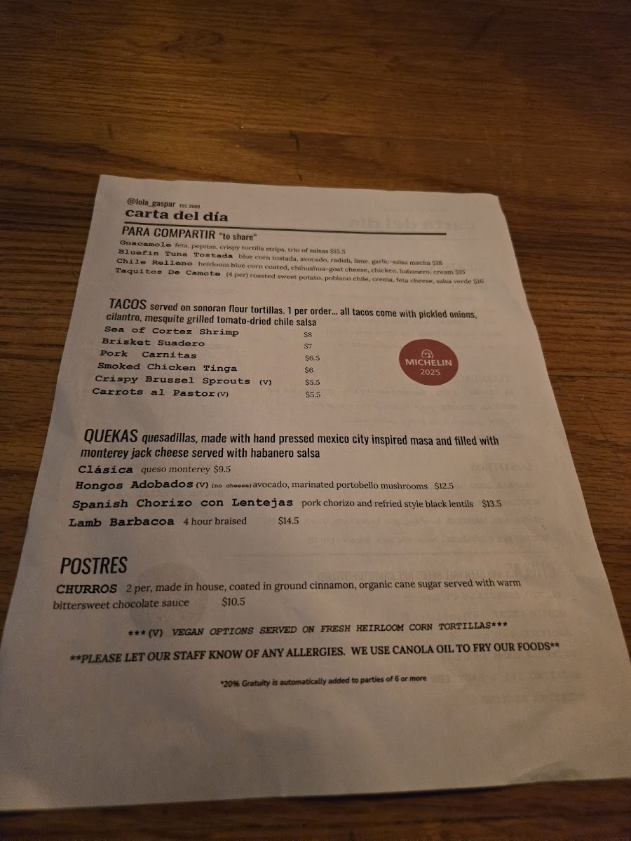 Lola Gaspar offers a thoughtfully curated menu that balances traditional Mexican flavors with inventive twists, perfect for enjoying casual dinners or relaxed gatherings. The food embraces a range of comforting and approachable dishes, from fresh guacamole served with house-made chips to more distinctive selections like pork carnitas tacos and charred octopus skewers. Whether you're sharing plates with friends or savoring an individual meal, the menu encourages moments of laid-back enjoyment.